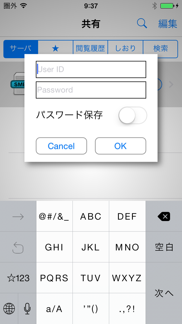 そのサーバをタップすると今度はユーザIDとパスワードを要求されます。